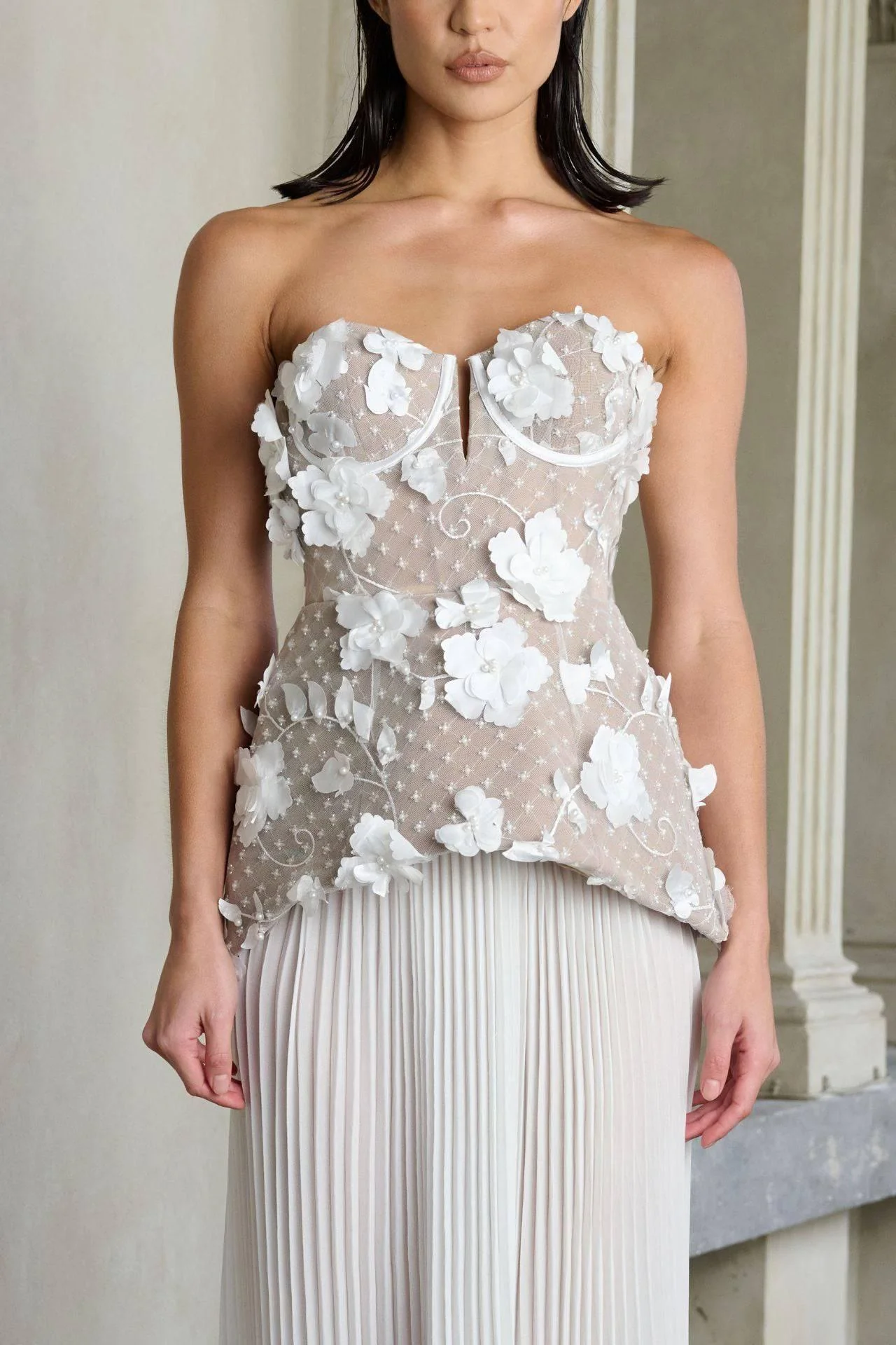 Turn heads in the Fiorella Gown, a timeless embodiment of elegance and glamour. Crafted from bespoke beaded tulle with 3D floral embellishments, the dress features a strapless neckline and contrasting boning channels beneath the layers to create structure and refinement. The Fiorella Gown gracefully cascades into a pleated chiffon skirt that is complemented by its curved bodice hemline. Complete with sculptured cups and an invisible zipper and decorative buttons at the centre back, the Fiorella Gown is designed to be the perfect dress that exudes modern charm for your special bridal events.