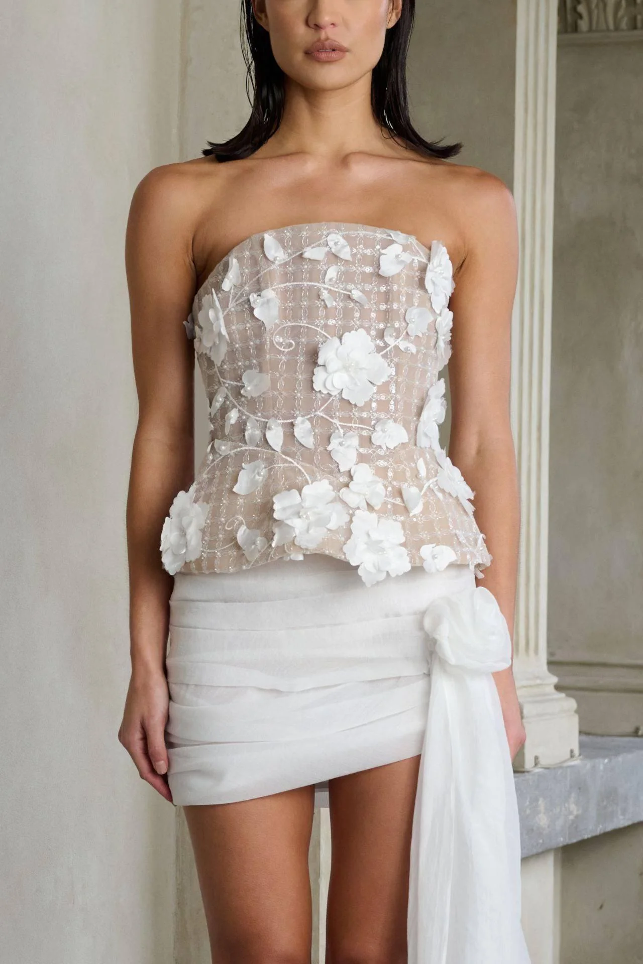 The Willow Skirt crafted from a luxurious white tulle, features a mini silhouette with diagonal gathers that gracefully cascade from the hip and extend into an elegant floor-length train. The skirt is adorned with a delicate flower detail at the beginning of the train and is complete with lining and an invisible zipper closure at the side seam. Perfectly paired with the Firosa Top, the Willow Skirt offers a sophisticated choice for the modern bride.