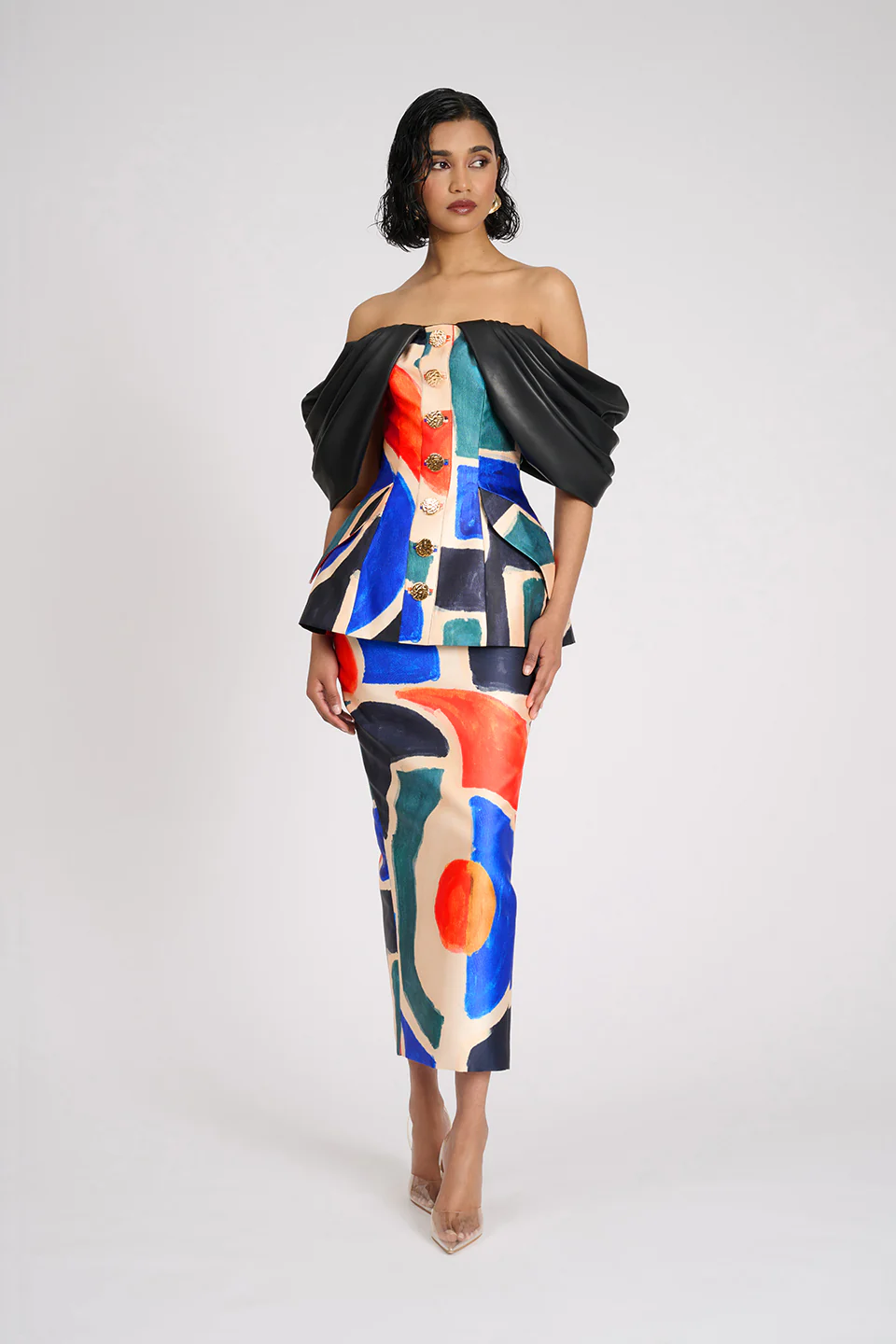 The Xander Top is a modern statement piece defined by structure, femininity, and elevated detail. Designed with off-the-shoulder sleeves, this fitted silhouette features internal boning and princess seams to shape and support the bodice. Decorative battered gold buttons run through the centre front, complemented by faux mock pockets and a flattering peplum hem. Finished in Eliya’s modern geometric abstract print, the Xander Top pairs seamlessly with the Maura Skirt for elevated day-to-evening dressing.
